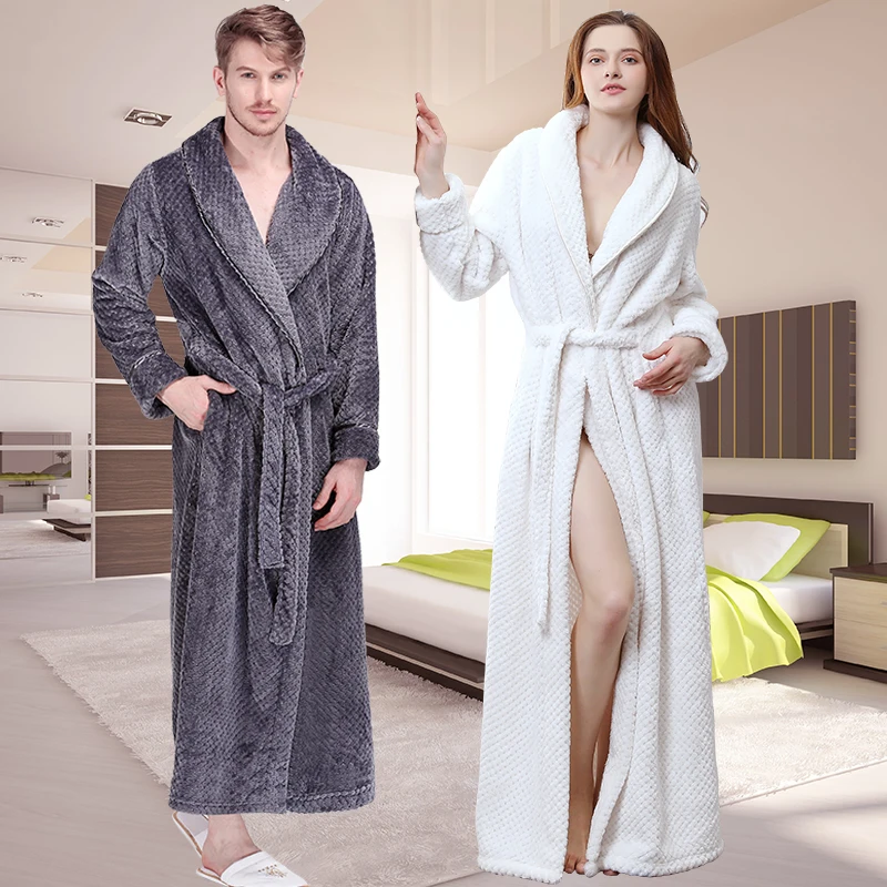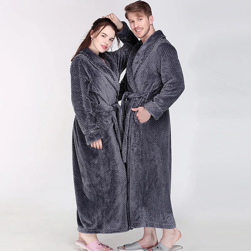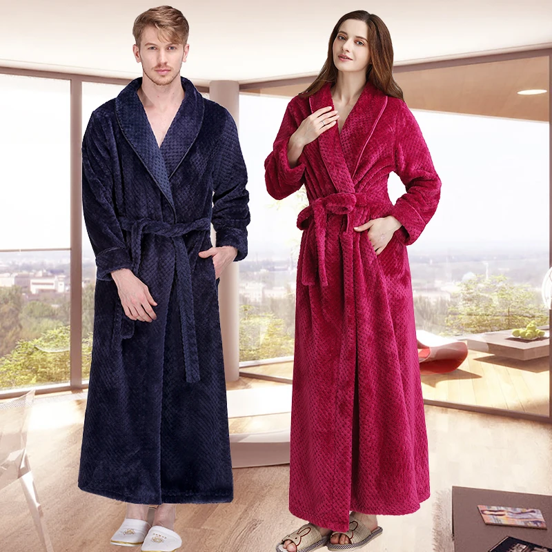 HIGH QUALITY Women Winter Extra Long Thick Grid Flannel Bath Robe Soft Peignoir Sexy Warm Dressing Gown Men Bath