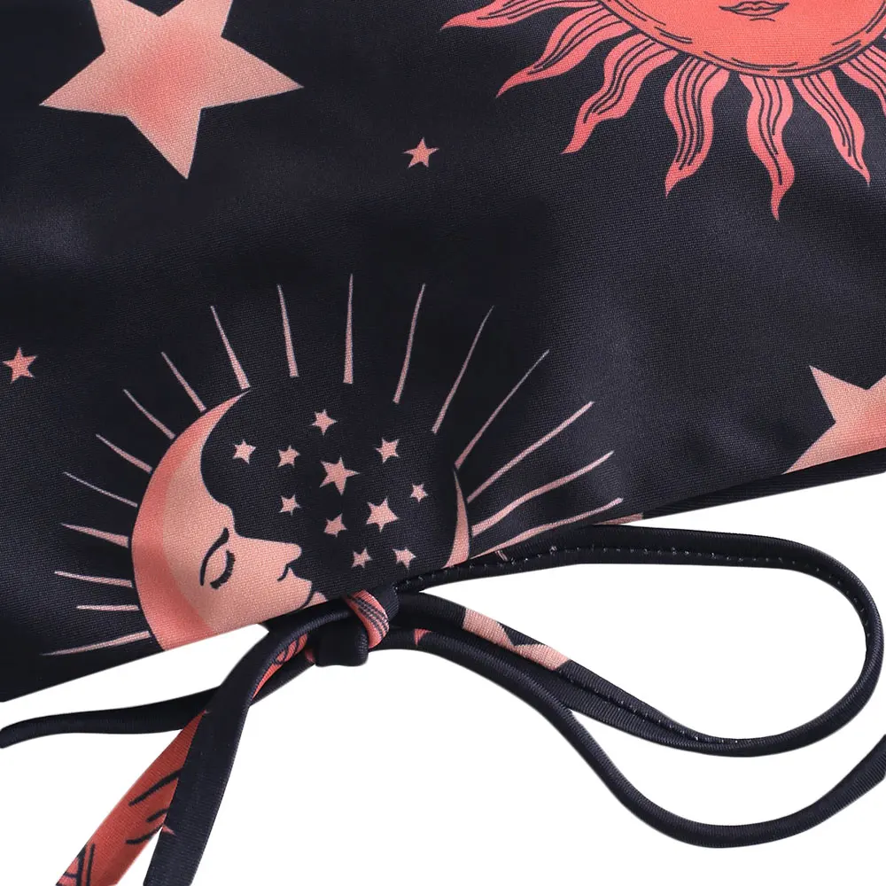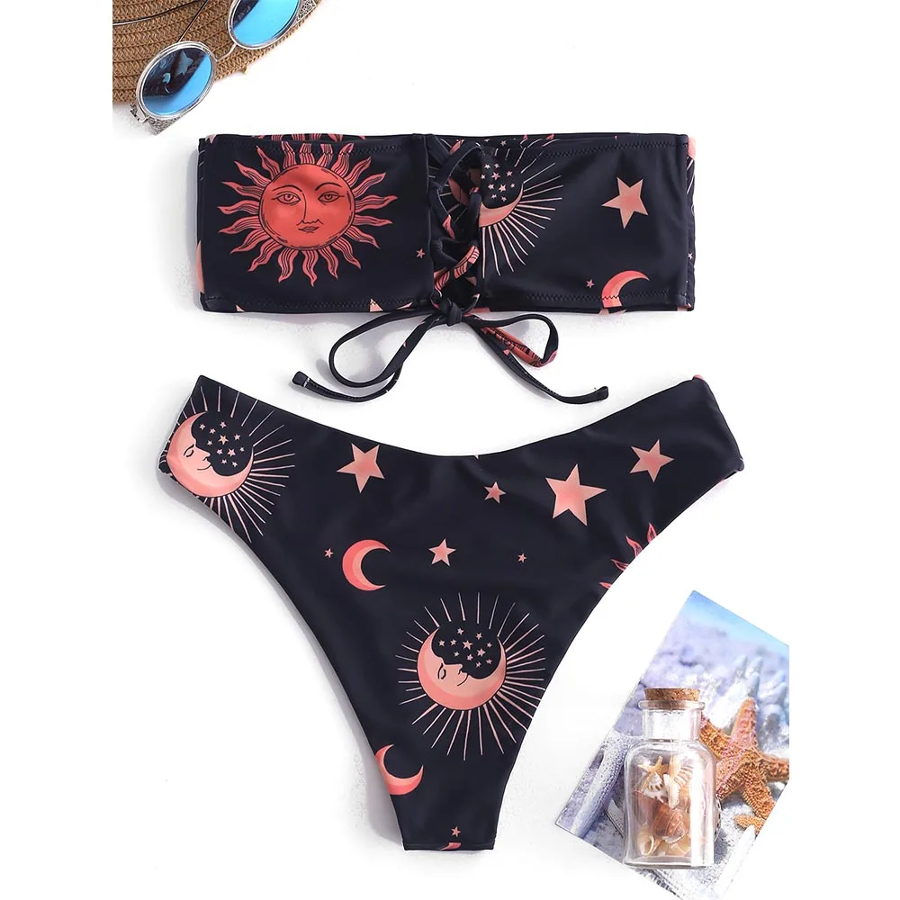 ZAFUL Sun Moon Star Print Bandeau Bikini Set 2019 Strapless Padded Lace up Swim Suit Wire Free Bath